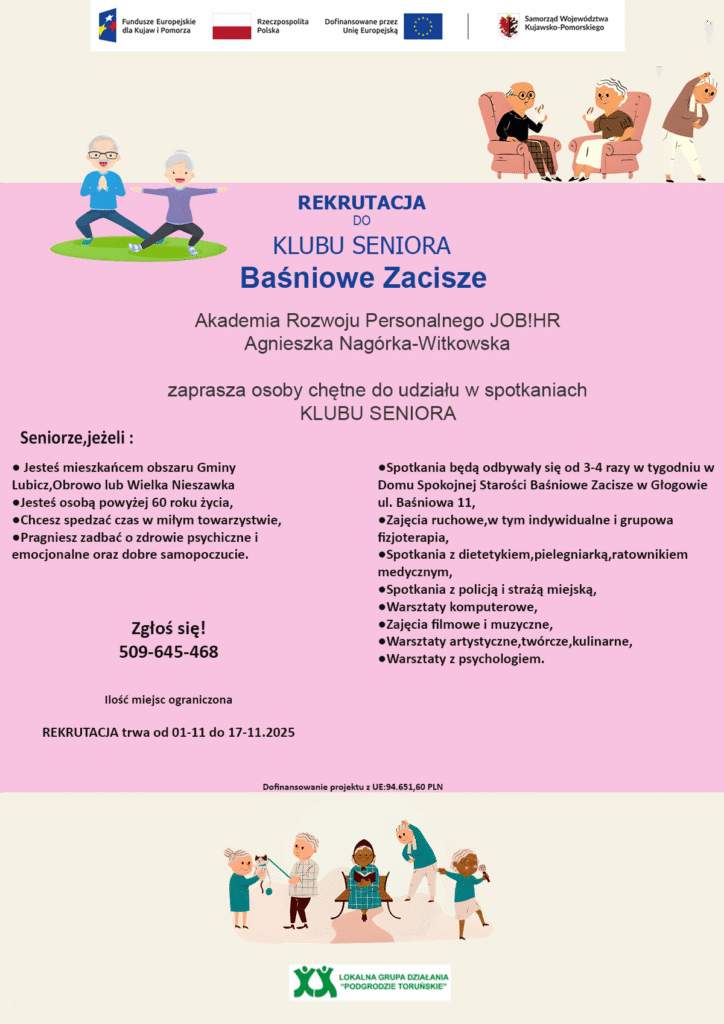 Projekt objęty grantem KLUB SENIORA BAŚNIOWE ZACISZE” ”, umowa o powierzenie grantu nr 3S/2025/EFS+/7 realizowany jest przez Akademię Rozwoju Personalnego JOB! HR Agnieszka Nagórka-Witkowska  w ramach Lokalnej Strategii Rozwoju Stowarzyszenia Lokalna Grupa Działania ,,Podgrodzie Toruńskie” 2023–2029, współfinansowany z Europejskiego Funduszu Społecznego + w ramach Programu Fundusze dla Kujaw i Pomorza na lata 2021-2027, Priorytet FEKP.07 FUNDUSZE EUROPEJSKIE NA ROZWÓJ LOKALNY, CP4 – Europa o silniejszym wymiarze społecznym, bardziej sprzyjająca włączeniu społecznemu i wdrażająca Europejski filar praw socjalnych.